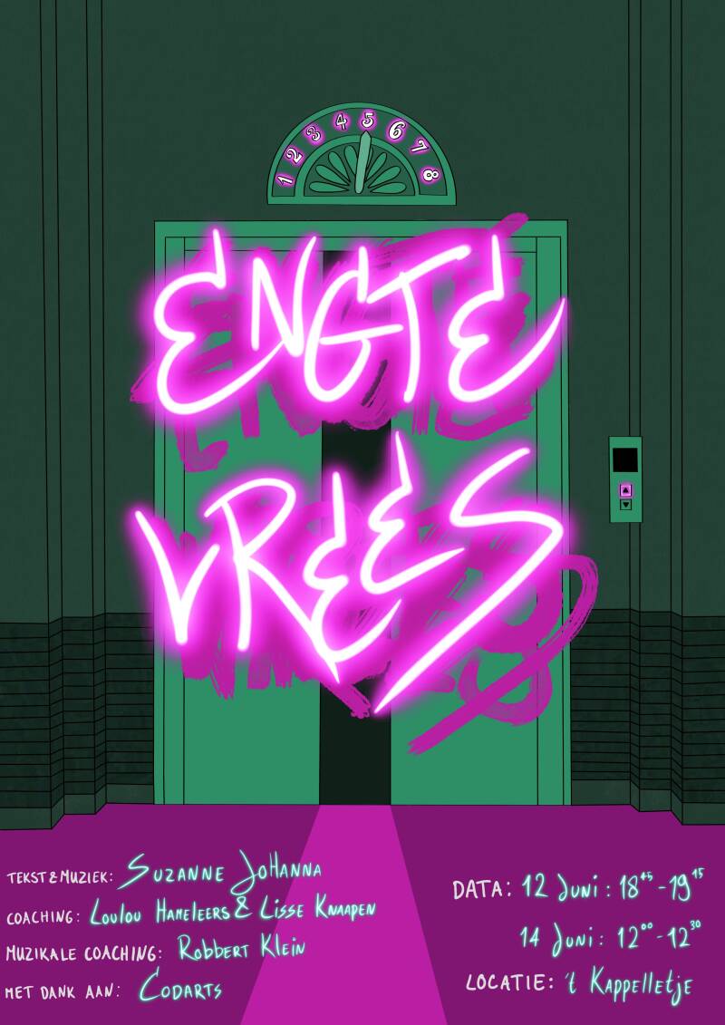 Zoals je ziet is de voorstelling twee keer te zien op het VP festival van Codarts. Maar... Dat is niet het enige moment! Ik mag mijn voorstelling namelijk als conceptalbum presenteren op het afstudeerfestival Enter! Dit festival wordt georganiseerd door ENT, afkorting voor Ensemble Nieuwe Theaterwerkers. Ik ben enorm blij dat ik mijn solo daar mag presenteren. Mocht je dus niet kunnen op 12 of 14 juni, wees niet getreurd! Op 23 juni om 20.15 uur speel ik Engtevrees, in de vorm van een conceptalbum, in de foyer van Zaal 3 in Den Haag. Mijn eerste tour ;). Hopelijk volgen daar nog meer voorstellingen op, maar nu eerst: tekst stampen!